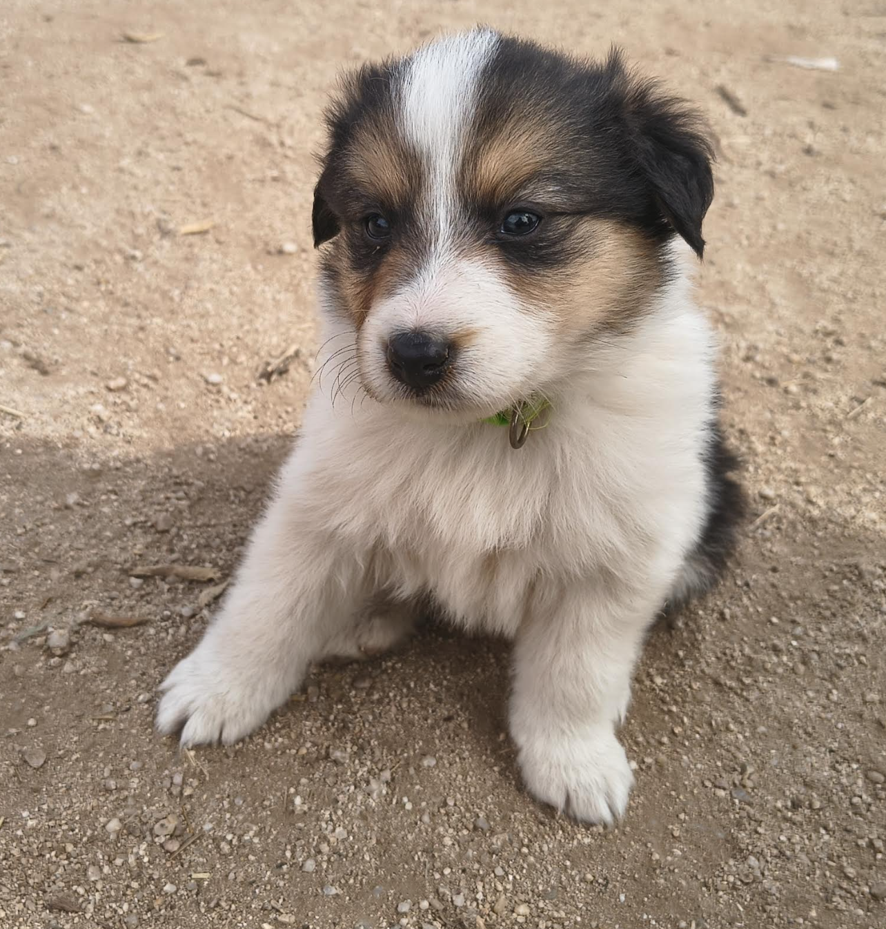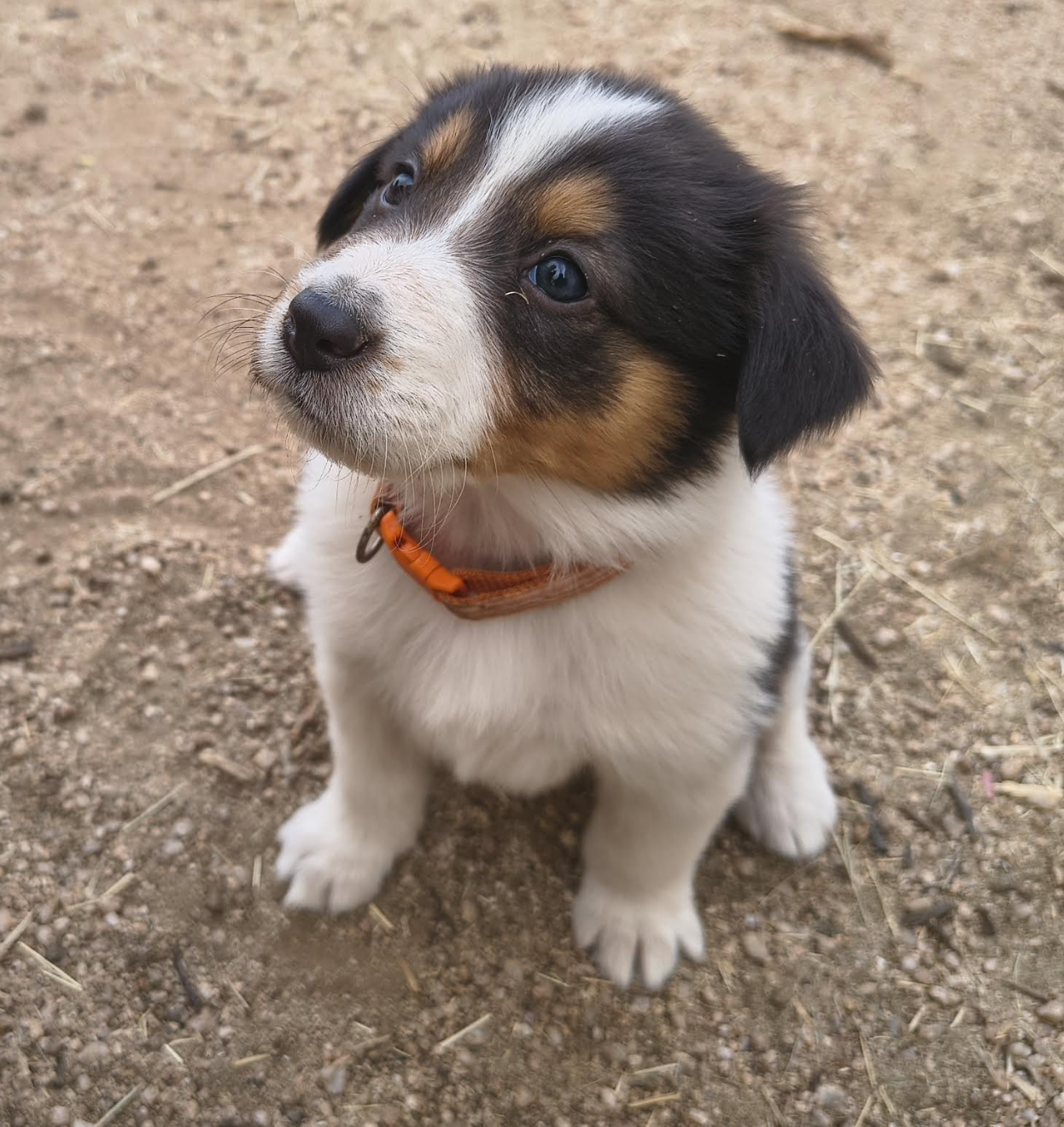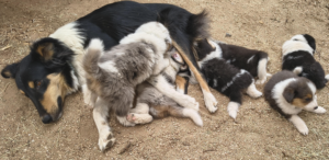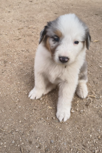 3 tri color females and 2 split faced blue merle females (we believe might be Lilac) available in central Arizona on May 4th. Parents are RIV Pony Boy Jesse of WillowHaven and Calaboose Kimmy Raven of WillowHaven. Parents are both good farm hands. Dad specializes in poultry protection/ herding, cat snuggler and visitor announcements. Mom specializes in catching escape piglets, singling out sheep & goats, herding ducks and fly & bee catching- and could be, with training, a bee allergy service dog. We performed the military ‘super dog’ exercises from 3 days old to 16 days old with this litter.